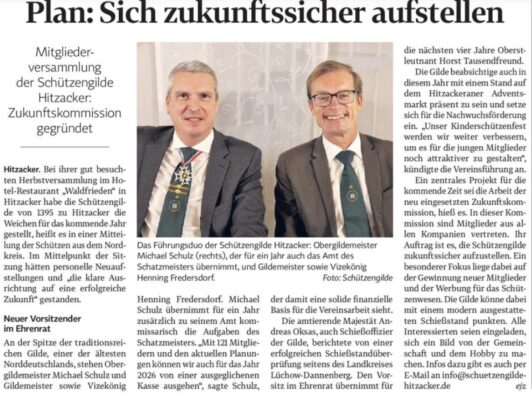 Im Rahmen ihrer gut besuchten Herbstversammlung im Hotel „Waldfrieden“ hat die traditionsreiche Schützengilde von 1395 zu Hitzacker (Elbe) e.V. wichtige Entscheidungen für die kommenden Jahre getroffen. Im Fokus standen dabei die Gründung einer neuen Zukunftskommission sowie die Bestätigung einer soliden finanziellen Basis.